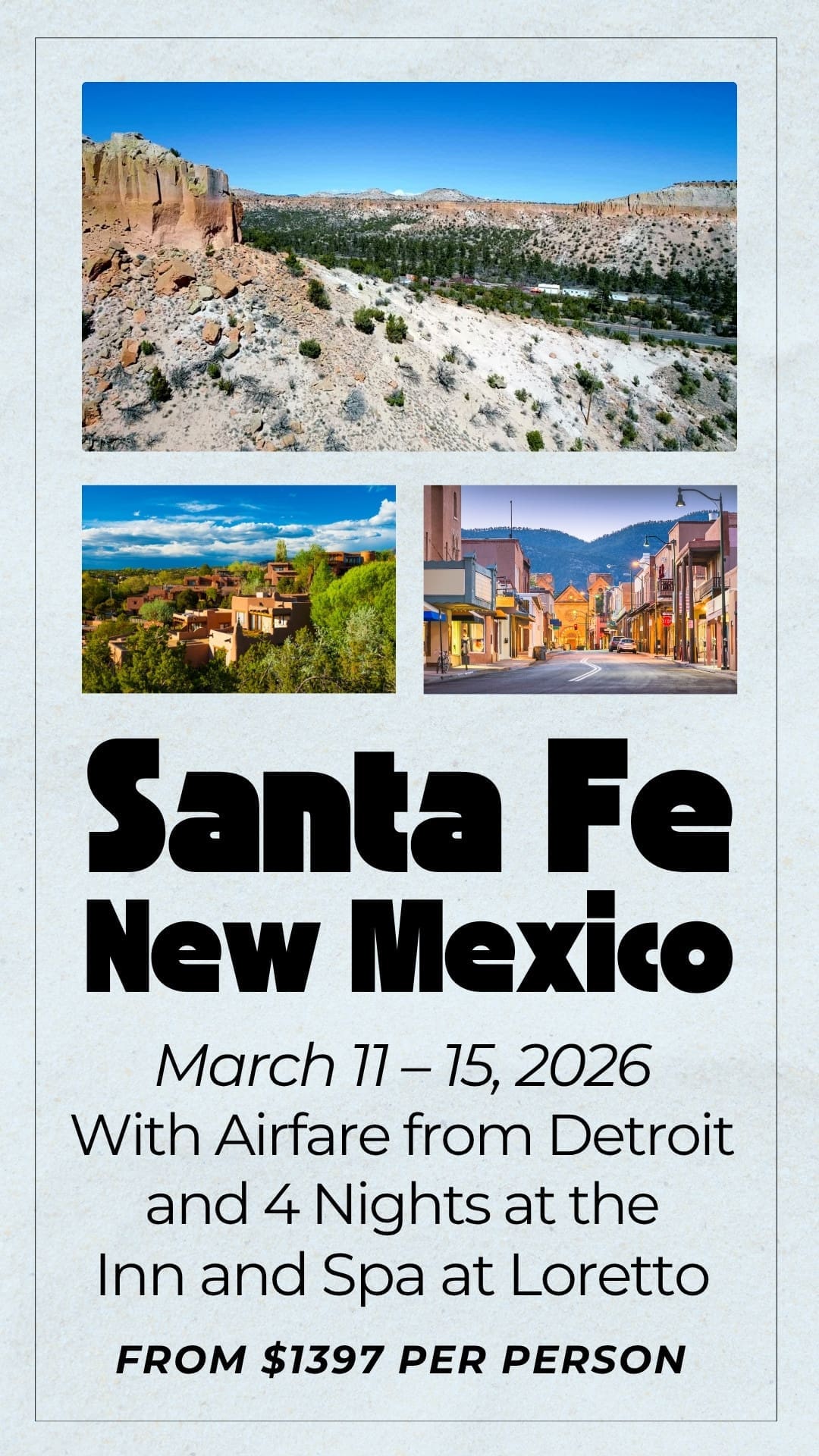 30 Sep Sante Fe Wellness in March Posted at 13:10h in $1000-2000, New Mexico, Santa Fe, Travel Specials Read More