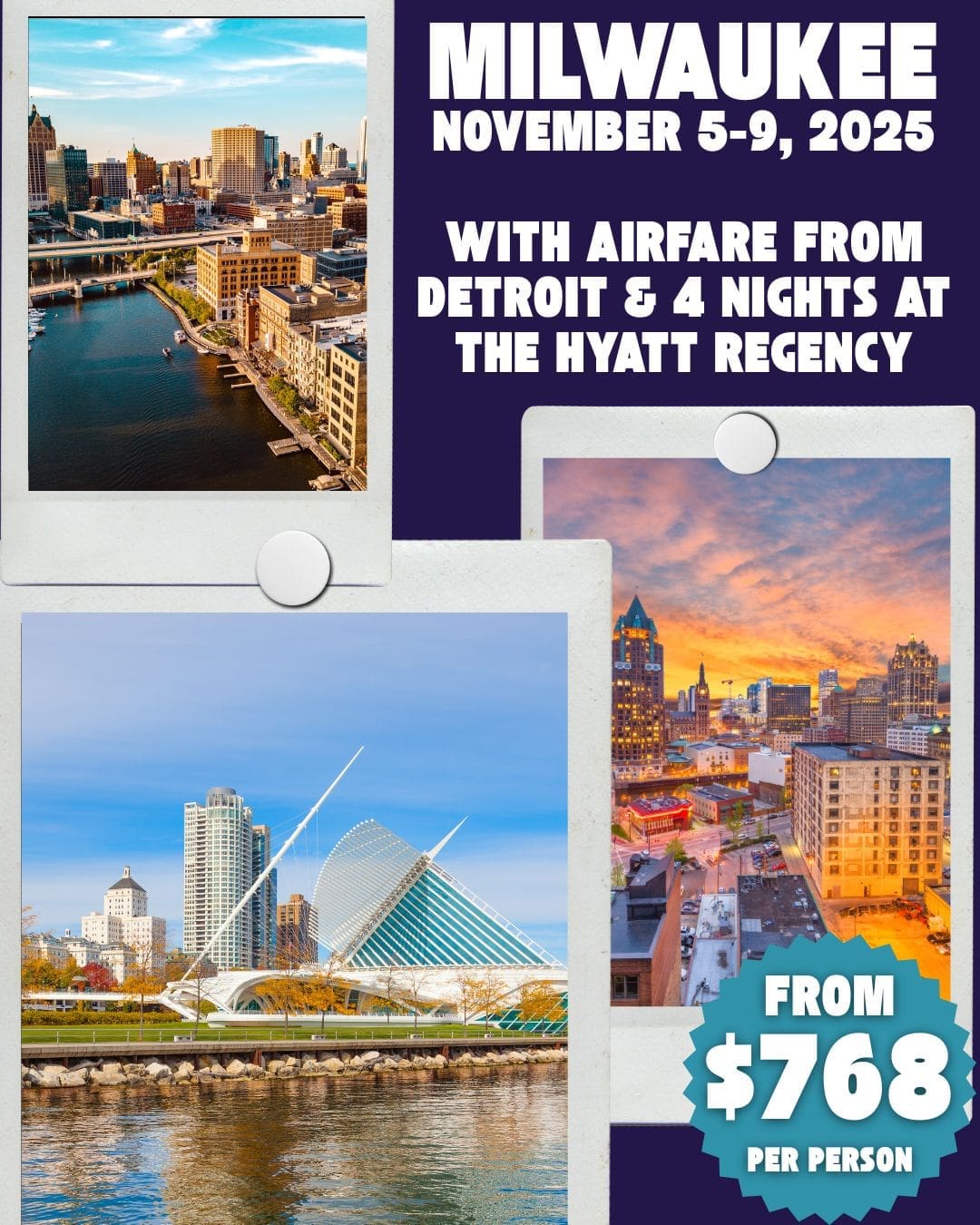 23 Sep Milwaukee in November Posted at 13:01h in $1000-2000, Milwaukee, Travel Specials, Wisconsin Read More